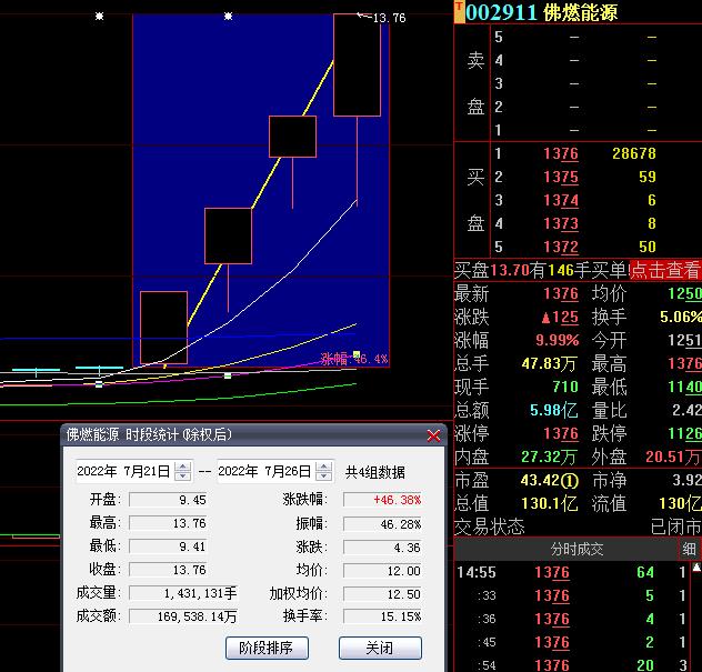 7月26日,佛燃能源再度漲停,截至收盤,報13.76元,連續(xù)4個交易日漲停,期間累計上漲達(dá)46.38%。