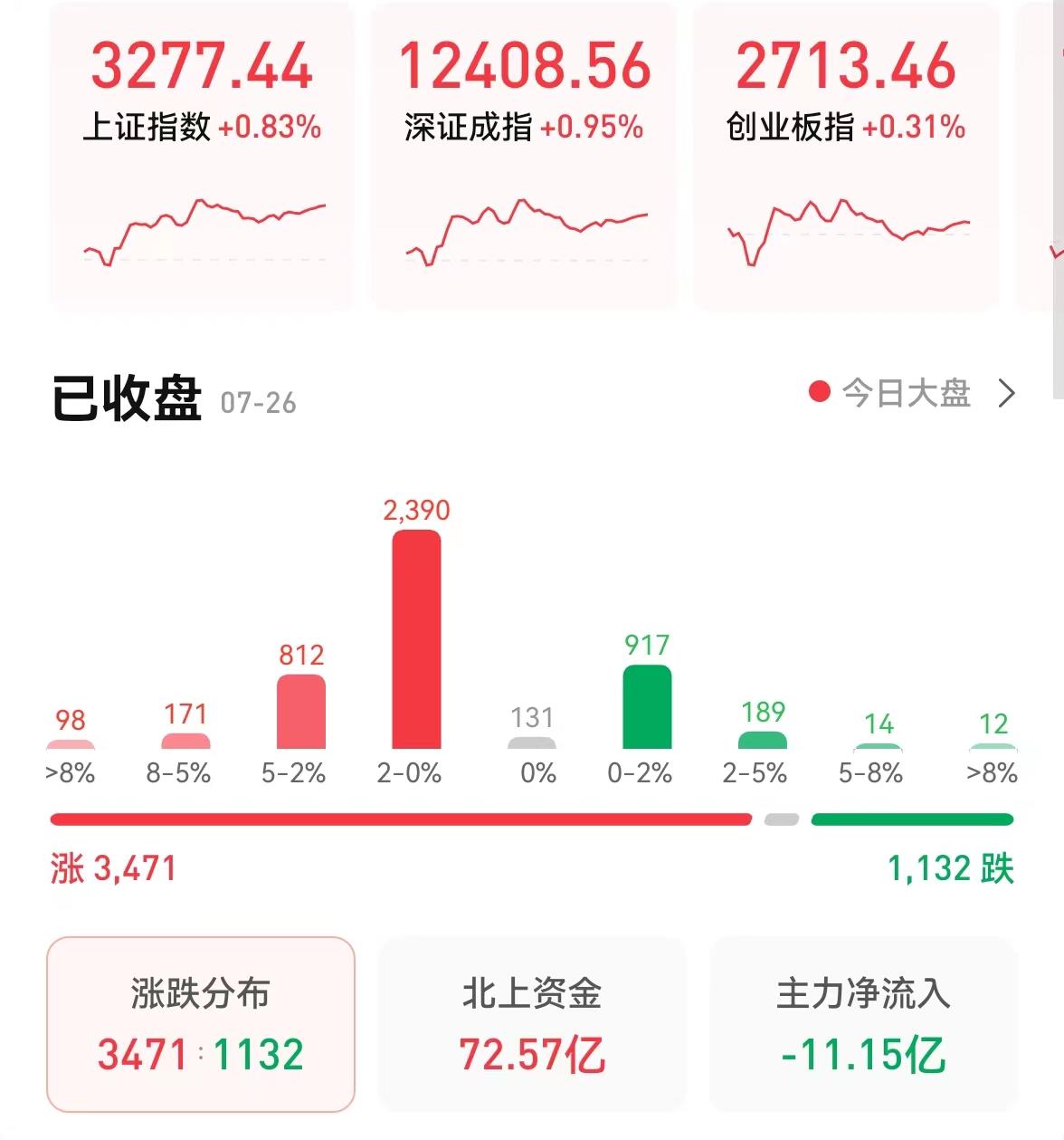 7月26日,A股三大指數(shù)集體收漲,截至收盤,上證指數(shù)漲幅達(dá)0.83%報3277.44點(diǎn),深證成指漲幅達(dá)0.95%報12408.56點(diǎn),創(chuàng)業(yè)板指漲幅達(dá)0.31%報2713.46點(diǎn);兩市合計成交金額達(dá)8341億元,北向資金凈買入72.57億元。個股方面,漲多跌少。