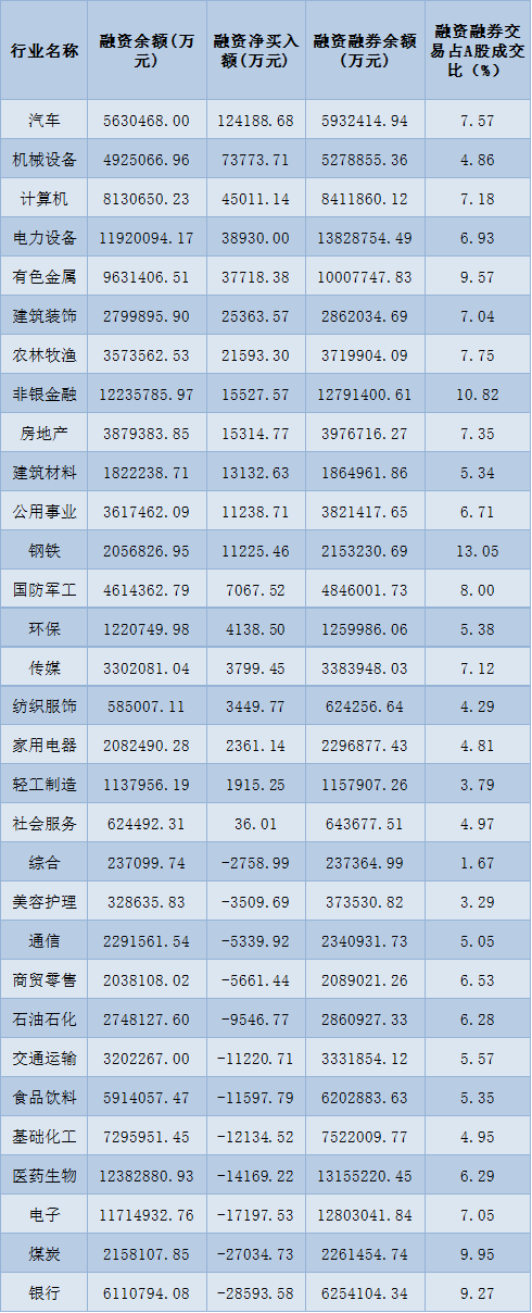 表:8月1日申萬一級(jí)行業(yè)兩融交易情況:
