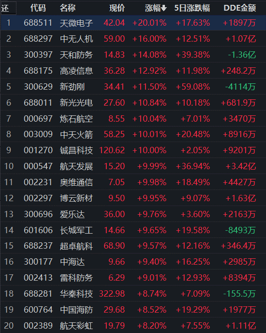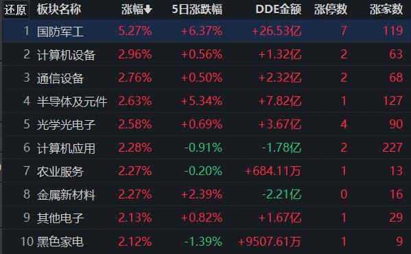 從漲幅居首的國防軍工行業(yè)看,截至8月3日11:30,行業(yè)交易中的125只個(gè)股有119只上漲,其中,有7只個(gè)股漲停,另有52只個(gè)股漲幅超5%。從資金流向看,國防軍工行業(yè)今天上午大單資金凈流入額達(dá)26.53億元,居行業(yè)第1位。