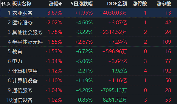 同花順行業(yè)方面,截至8月4日上午收盤,76類行業(yè)中50類上漲,占比65.79%,其中,農(nóng)業(yè)服務(wù)漲幅達(dá)3.67%,排名首位,此外,醫(yī)療服務(wù)漲幅也超2%。下跌的行業(yè)中,汽車整車跌幅居首,跌幅達(dá)2.52%。