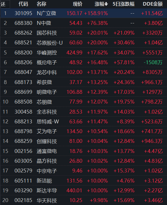 從漲幅居首的半導(dǎo)體及元件行業(yè)看,截至8月5日11:30,行業(yè)交易中的153只個(gè)股有142只上漲,其中,有9只個(gè)股漲停。從資金流向看,半導(dǎo)體及元件行業(yè)今天上午大單資金凈流入額達(dá)67.84億元,居行業(yè)第1位。