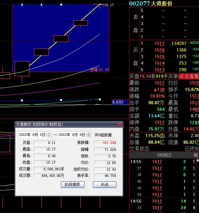 8月8日,熱門股大港股份再度漲停,截至收盤,報(bào)15.17元,實(shí)現(xiàn)5連板累計(jì)漲幅達(dá)61.04%。