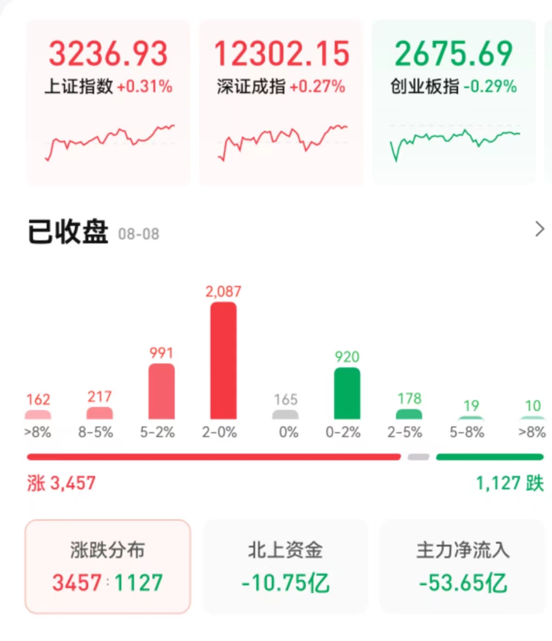 8月8日,三大股指漲跌不一,截至收盤,上證指數(shù)漲幅達(dá)0.31%報(bào)3236.93點(diǎn),深證成指漲幅達(dá)0.27%報(bào)12302.15點(diǎn),創(chuàng)業(yè)板指跌幅達(dá)0.29%報(bào)2675.69點(diǎn);兩市合計(jì)成交9523億元,北向資金凈賣出10.75億元??傮w來看,A股個(gè)股漲多跌少。