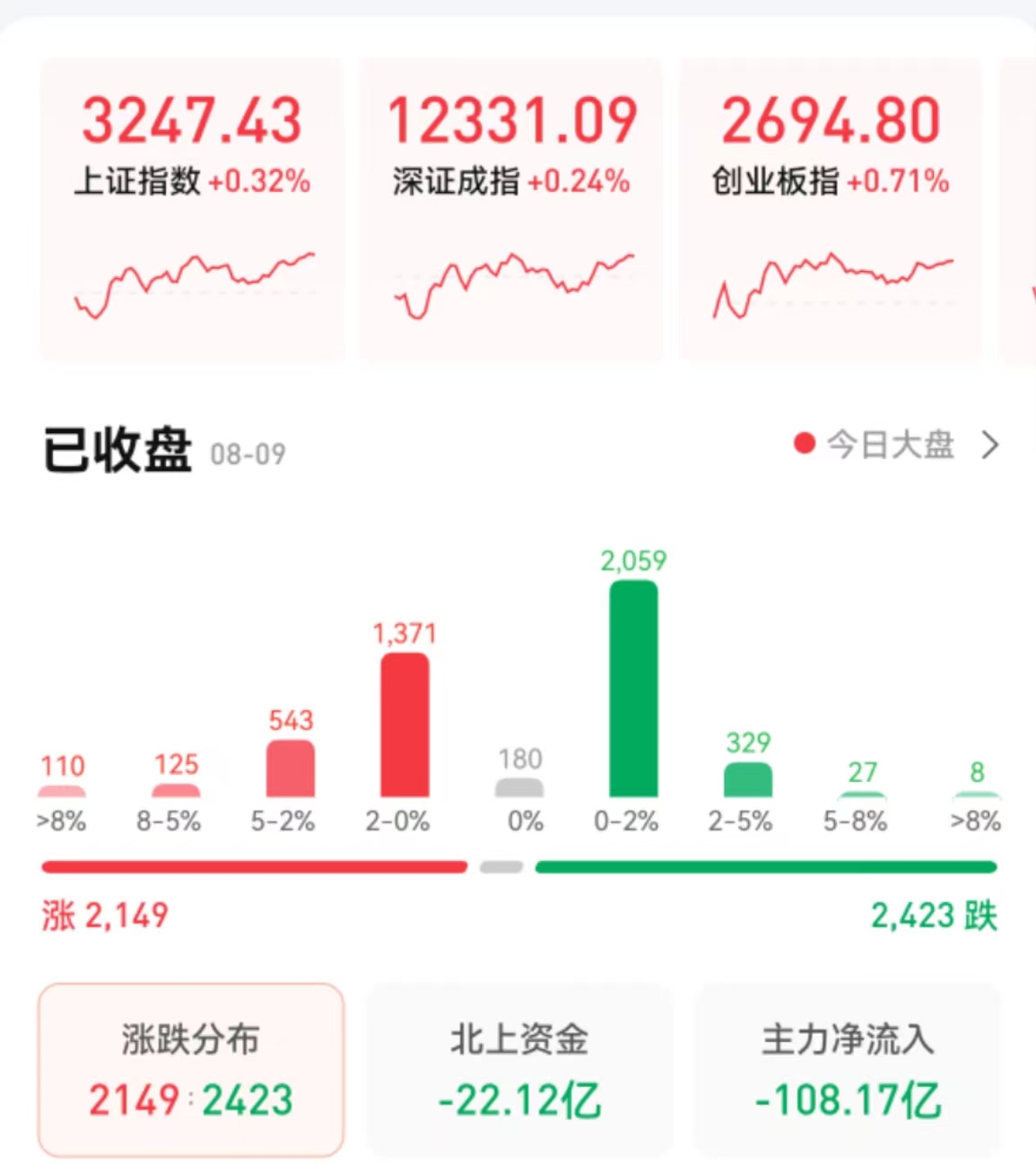 8月9日,三大股指全線飄紅,截至收盤,上證指數(shù)漲幅達(dá)0.32%報(bào)3247.43點(diǎn),實(shí)現(xiàn)四連陽;深證成指漲幅達(dá)0.24%報(bào)12331.09點(diǎn),創(chuàng)業(yè)板指漲幅達(dá)0.71%報(bào)2694.8點(diǎn);兩市合計(jì)成交9530億元,北向資金凈賣出22.12億元。總體來看,A股個(gè)股跌多漲少。