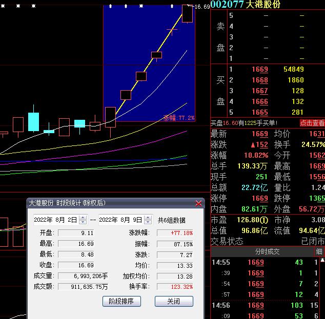 8月9日,熱門芯片股大港股份再度漲停,截至收盤,報(bào)16.69元,實(shí)現(xiàn)6連板累計(jì)漲幅達(dá)77.18%。