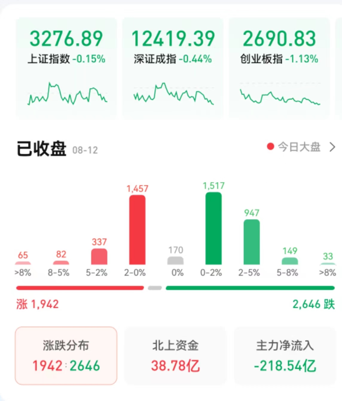 8月12日,三大股指集體收跌,截至收盤,上證指數(shù)跌幅達(dá)0.15%報3276.89點(diǎn),深證成指跌幅達(dá)0.44%報12419.39點(diǎn),創(chuàng)業(yè)板指跌幅達(dá)1.13%報2690.83點(diǎn);兩市合計(jì)成交額9995億元,北向資金凈買入38.78億元??傮w來看,A股個股跌多漲少。