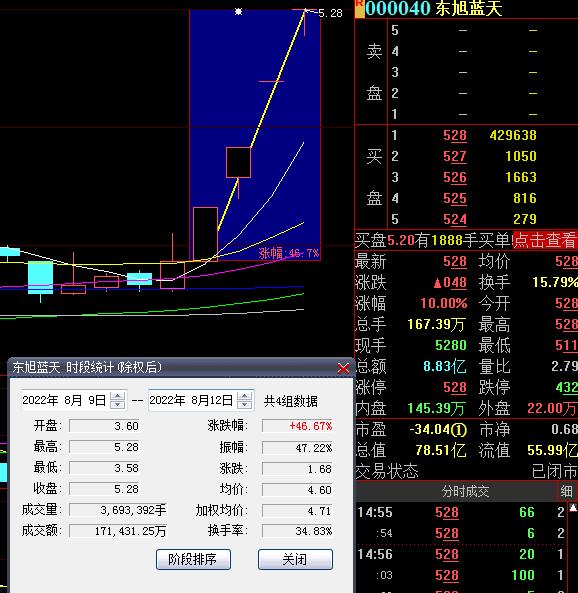 8月12日,熱門股東旭藍(lán)天再度漲停,截至收盤,報5.28元,實(shí)現(xiàn)4連板累計(jì)漲幅達(dá)46.67%。