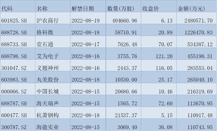 表:下周解禁金額前十位(本周收盤(pán)價(jià)計(jì)算)