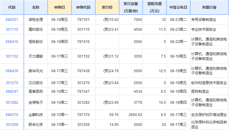 新股方面,根據(jù)發(fā)行安排,A股市場(chǎng)下周(8月15日-8月19日)將有10只新股申購(gòu)。