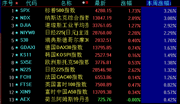 本周全球主要指數(shù)表現(xiàn)強(qiáng)勢(shì)。周五,美股三大指數(shù)集體收漲,道指漲1.27%,本周累計(jì)上漲2.92%;標(biāo)普500指數(shù)漲1.73%,本周累計(jì)上漲3.26%,納斯達(dá)克指數(shù)漲2.09%,本周累計(jì)上漲3.08%。