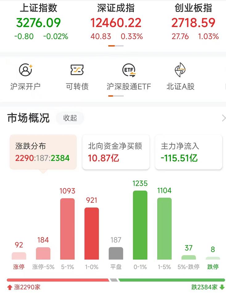 今日三大指數(shù)走勢(shì)分化,上證指數(shù)維持弱勢(shì)盤(pán)整,創(chuàng)業(yè)板指漲超1%。截至收盤(pán),上證指數(shù)跌0.02%報(bào)3276.09點(diǎn),深證成指漲0.33%報(bào)12460.22點(diǎn),創(chuàng)業(yè)板指漲1.03%報(bào)2718.59點(diǎn);兩市合計(jì)成交額達(dá)9764億元,北向資金凈買(mǎi)入10.87億元。總體來(lái)看,個(gè)股跌多漲少,4856只交易中的個(gè)股,有2290只上漲。