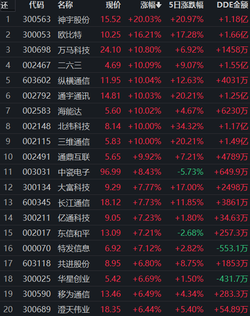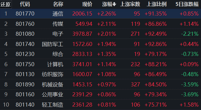 通信行業(yè)104只交易中的個股,有95只上漲,占比91.35%,其中,有11只個股漲停,42只個股漲幅超5%。