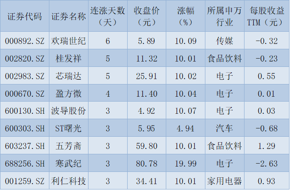 表:連續(xù)上漲3天且今日收盤漲停股一覽