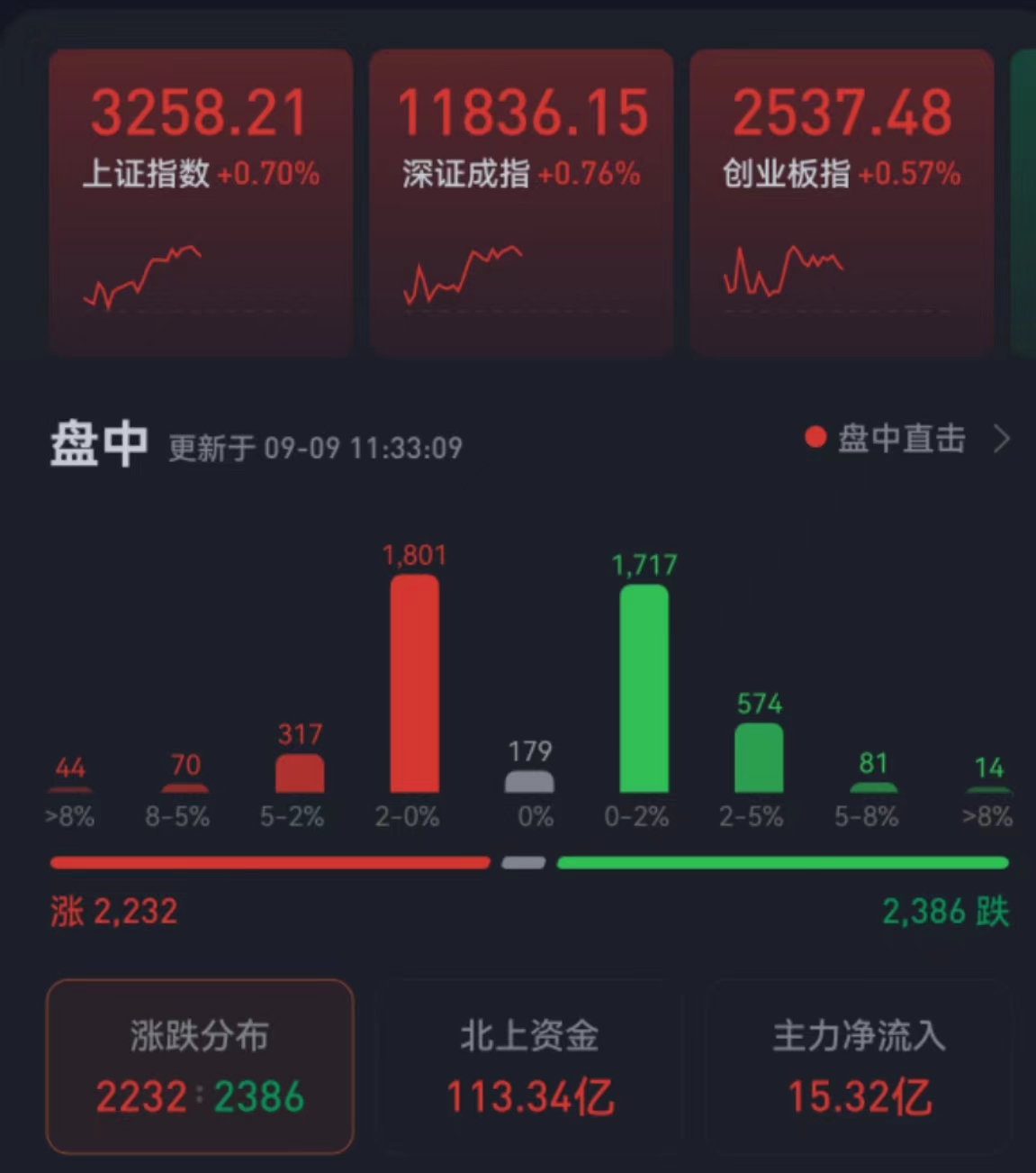 周五(9月9日),三大股指震蕩反彈,全線飄紅。截至上午收盤,上證指數(shù)漲幅達(dá)0.70%,報(bào)3258.21點(diǎn);深證成指和創(chuàng)業(yè)板指漲幅分別為0.76%和0.57%;滬深兩市合計(jì)成交額5028.9億元。
