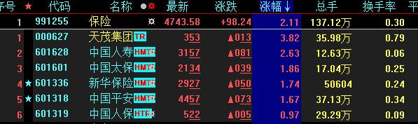 具體看,截至9月9日上午收盤,保險(xiǎn)板塊走強(qiáng),漲幅居首,達(dá)2.11%。其中,天茂集團(tuán)、中國(guó)人壽等個(gè)股漲幅居前,均超2%。
