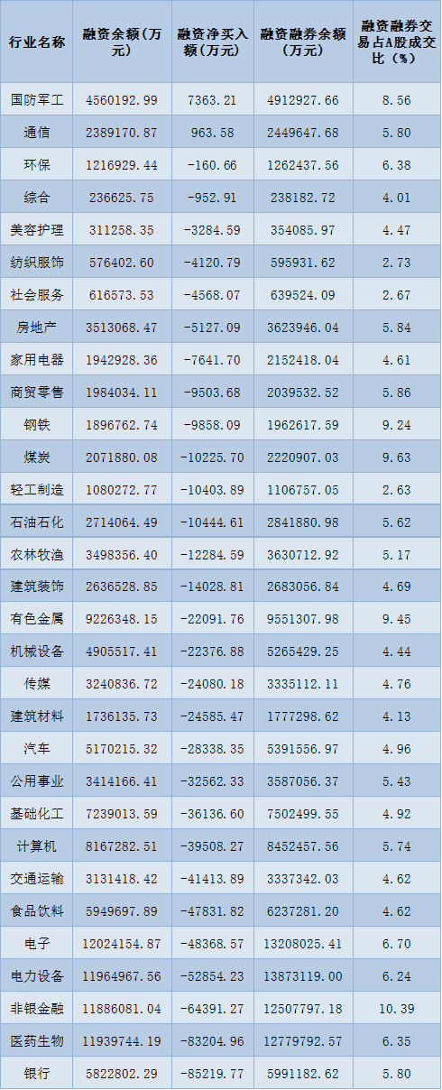表:9月9日申萬一級(jí)行業(yè)兩融交易情況: