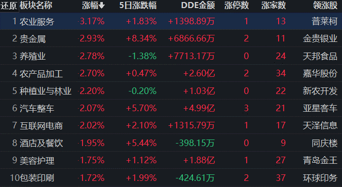 同花順行業(yè)方面,截至9月13日11:30,76類行業(yè)中58類上漲,占比76.32%,其中,農(nóng)業(yè)服務(wù)行業(yè)漲幅達(dá)3.17%,排名首位,貴金屬行業(yè)漲幅達(dá)2.93%,居第二位。下跌的行業(yè)中,醫(yī)療服務(wù)行業(yè)居首,跌幅達(dá)1.91%。