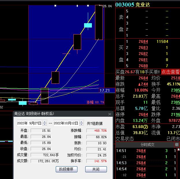 10月12日,熱門(mén)股競(jìng)業(yè)達(dá)再度漲停,截至收盤(pán),報(bào)26.84元,實(shí)現(xiàn)7連漲,其中有5個(gè)交易日達(dá)到漲停板,累計(jì)漲幅達(dá)68.7%。