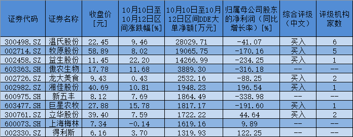 表:10月10日至10月12日期間,豬肉板塊獲大單資金凈流入額超1000萬元個股一覽