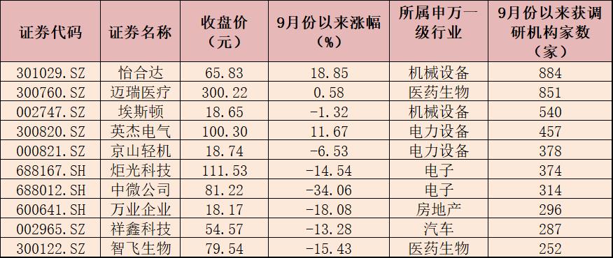 表:9月份以來(lái)獲調(diào)研機(jī)構(gòu)家數(shù)居前10的公司一覽