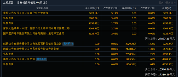 據(jù)同花順機(jī)構(gòu)成功率回測(cè)顯示,中信證券股份有限公司客戶資產(chǎn)管理部買入8720.11萬(wàn),該營(yíng)業(yè)部買入后,次日上漲概率61%,平均盈利1.04%。收益率最高的是持股30天后賣出,收益率5.60%,成功率50%。機(jī)構(gòu)專用買入5807.27萬(wàn),該營(yíng)業(yè)部買入后,次日上漲概率50%,平均盈利0.39%。收益率最高的是持股1天后賣出,收益率0.39%,成功率50%。