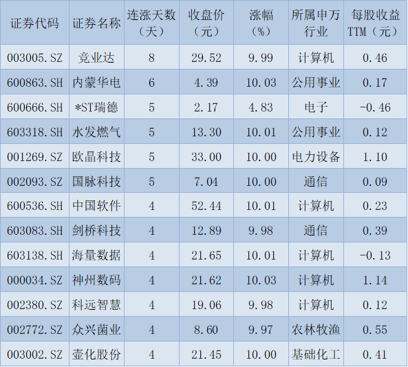 表:連續(xù)上漲4天且今日收盤(pán)漲停股一覽
