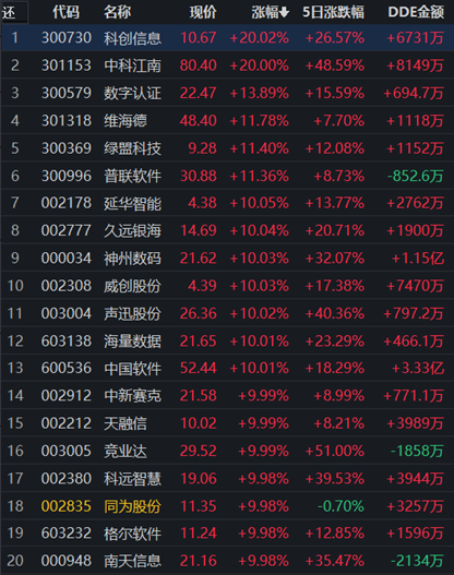 10月13日,申萬(wàn)一級(jí)行業(yè)中計(jì)算機(jī)行業(yè)領(lǐng)漲,漲幅達(dá)2.67%,獲得9.91億元大單資金的凈流入。行業(yè)265只交易中的個(gè)股,有247只上漲,占比93.21%,其中,50只個(gè)股漲幅超5%。