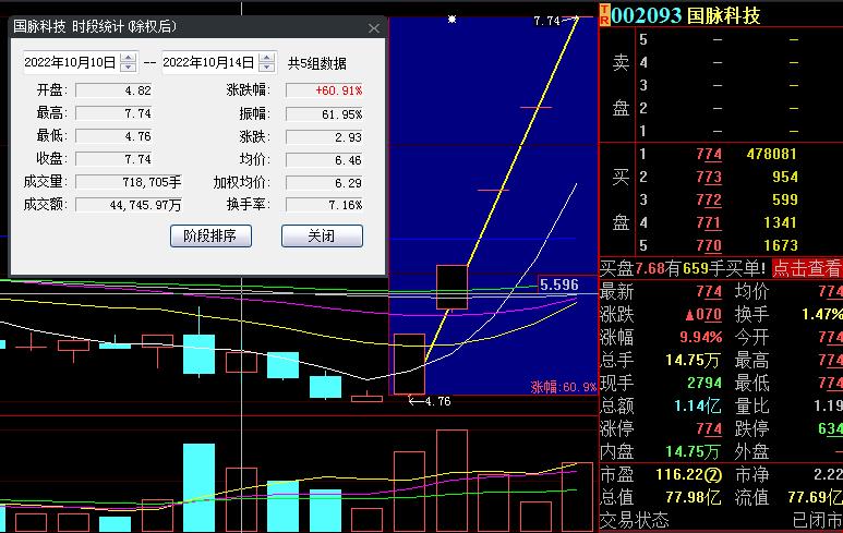10月14日,熱門股國脈科技再度漲停,截至收盤,報(bào)7.74元,連續(xù)5個交易日漲停,累計(jì)漲幅達(dá)60.91%。