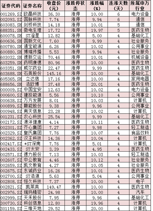 表:連續(xù)上漲4日且今日收盤漲停個股情況: