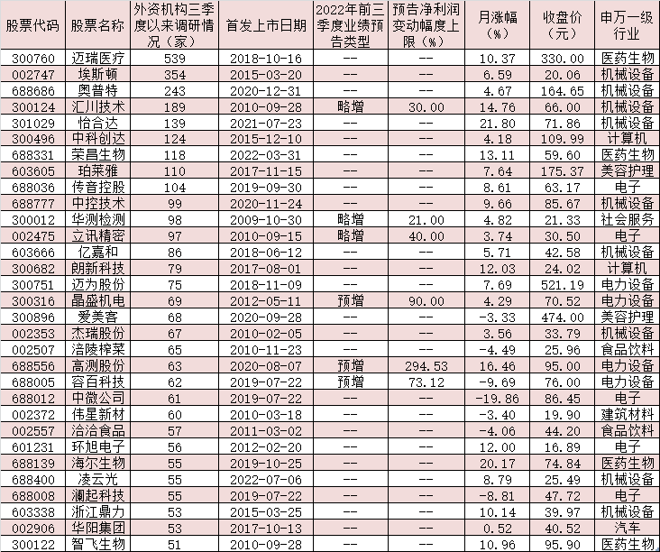 表:三季度以來獲超50家外資機(jī)構(gòu)調(diào)研的公司