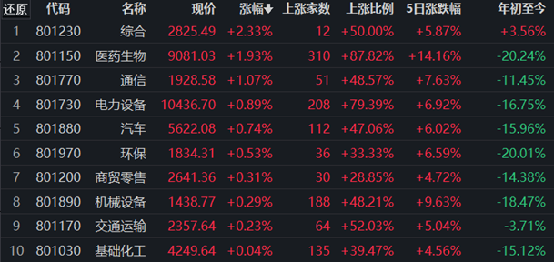 31類申萬一級(jí)行業(yè)中,有14類上漲,占比45.16%,其中,綜合行業(yè)漲2.33%,居首;下跌方面,房地產(chǎn)行業(yè)居首,跌幅達(dá)1.13%。