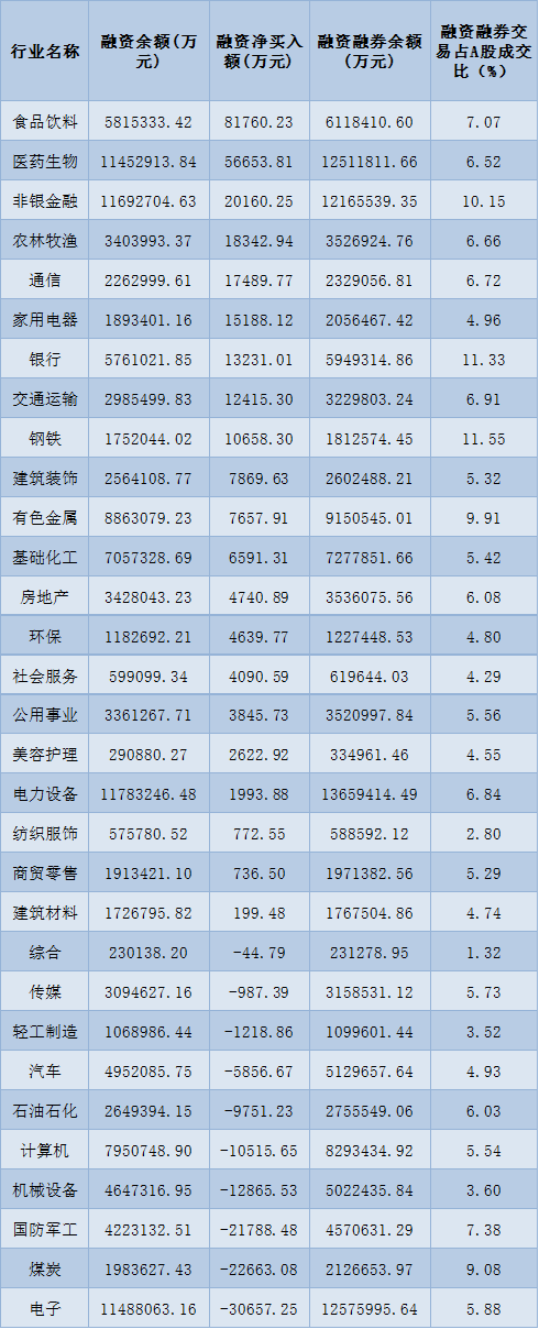表:10月19日申萬一級(jí)行業(yè)兩融交易情況: