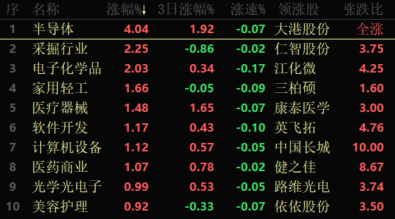 東方財(cái)富行業(yè)方面,截至10月20日11:30,86類行業(yè)中29類上漲,占比33.72%,其中,半導(dǎo)體行業(yè)漲幅達(dá)4.04%,排名首位,采掘和電子化學(xué)品行業(yè)漲幅均超2%。下跌的行業(yè)中,航運(yùn)港口居首,跌幅達(dá)2.63%,此外,電池和光伏設(shè)備行業(yè)的跌幅也均超2%。