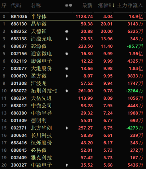 從漲幅居首的半導(dǎo)體行業(yè)看,截至10月20日11:30,該行業(yè)交易中的126只個(gè)股全線上漲,其中31只漲幅超5%。從資金流向看,該行業(yè)今天上午大單資金凈流入額達(dá)13.9億元,居行業(yè)第1位。
