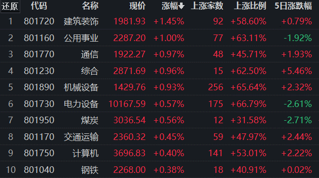 31類申萬一級行業(yè)中,有15類上漲,其中,建筑裝飾行業(yè)漲1.45%,居首;下跌方面,美容護(hù)理行業(yè)居首,跌幅達(dá)3.05%。