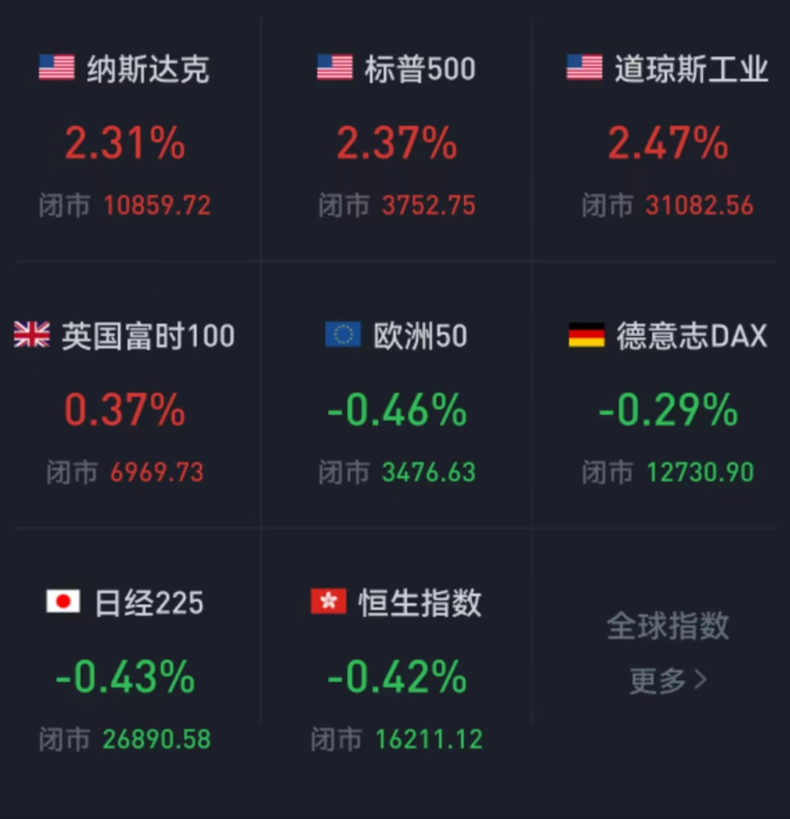 周五,美國三大股指全線收漲,道指漲2.47%報31082.56點,標(biāo)普500指數(shù)漲2.37%報3752.75點,納指漲2.31%報10859.72點。本周,美股周漲幅創(chuàng)階段新高,道指漲4.89%,標(biāo)普500指數(shù)漲4.74%,納指漲5.22%。