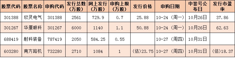 下周將有4只新股發(fā)行,其中,科創(chuàng)板1家,創(chuàng)業(yè)板2家,上交所主板1家,累計發(fā)行數(shù)量共計約1.33億股,預(yù)計募集資金26.39億元。具體看,10月24日發(fā)行的是欣靈電氣、華廈眼科,10月27日發(fā)行的是耐科裝備、南方路機。