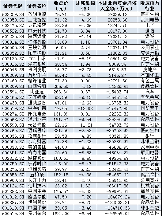 資金方面,周五,北向資金全天單邊凈賣出89.23億元,創(chuàng)8月23日以來新高;本周5個交易日北向資金連續(xù)減倉,累計凈流出金額達293.3億元,創(chuàng)逾7個月新高。從前十大成交活躍股來看,本周,藥明康德、三花智控等2只個股,北向資金凈買入金額均超2億元。另外,貴州茅臺、中國平安、伊利股份、隆基綠能等個股遭北向資金凈賣出金額均超10億元。