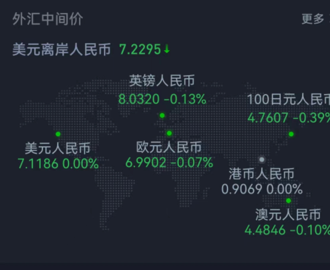 周五在岸人民幣兌美元16:30收盤報7.2494,較上一交易日跌117個基點,本周累跌563個基點;周五夜盤收報7.2244。人民幣兌美元中間價報7.1186,調(diào)升2個基點,本周累計調(diào)貶98個基點。交易員指出,中間價表現(xiàn)仍體現(xiàn)監(jiān)管層態(tài)度,市場將關(guān)注下周中間價及匯價走向。
