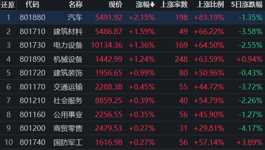 31類申萬一級(jí)行業(yè)中,有12類上漲,占比38.71%,其中,汽車行業(yè)漲2.15%,居首;下跌方面,醫(yī)藥生物行業(yè)居首,跌幅達(dá)2.26%。
