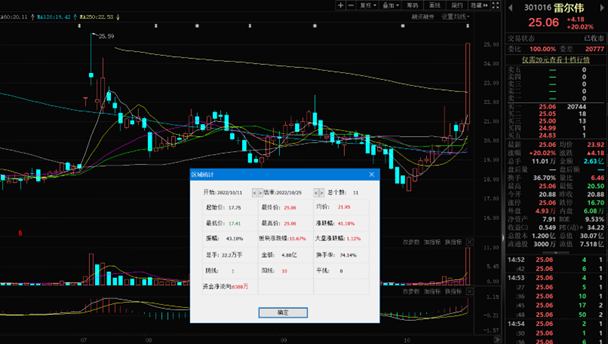 10月25日,雷爾偉以25.06元封漲停板報(bào)收,漲幅達(dá)20.02%。該股自10月11日以來,截至10月25日已連續(xù)11個(gè)交易日上漲,累計(jì)漲幅達(dá)41.18%。該股最新A股總市值達(dá)30.07億元,A股流通市值7.52億元。