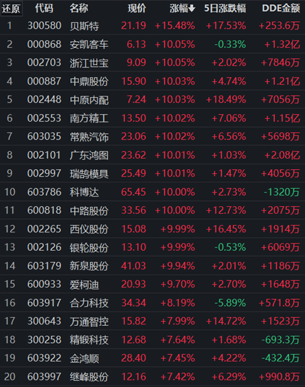 10月25日,申萬一級(jí)行業(yè)中汽車行業(yè)領(lǐng)漲,漲幅達(dá)2.15%,獲得10.21億元大單資金的凈流入,居第一位。行業(yè)237只交易中的個(gè)股,有198只上漲,占比83.54%,其中,41只個(gè)股漲幅超5%。