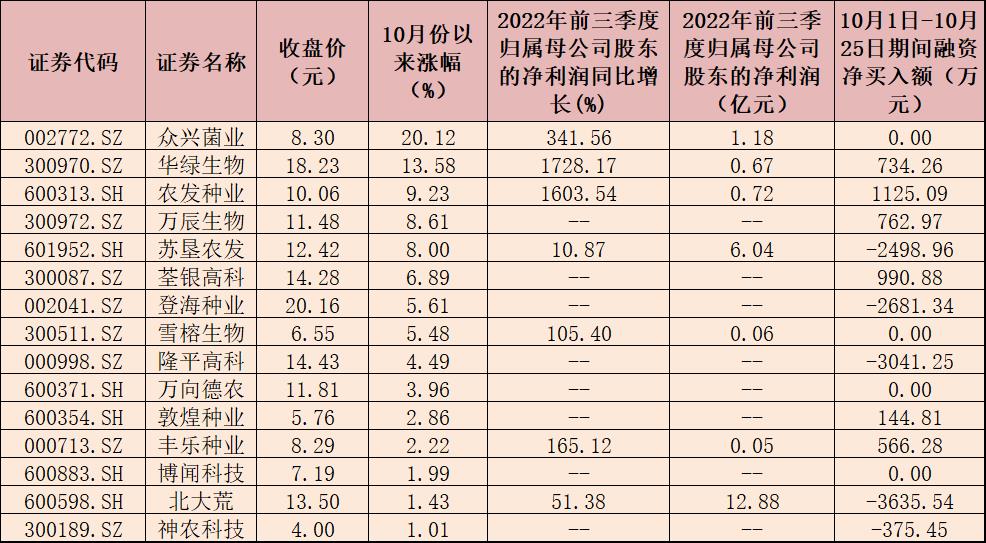 表:10月份以來漲幅超1%的種植業(yè)股一覽