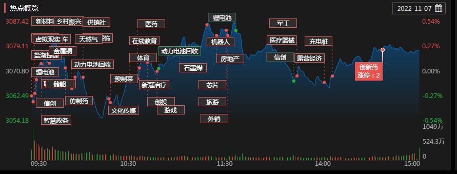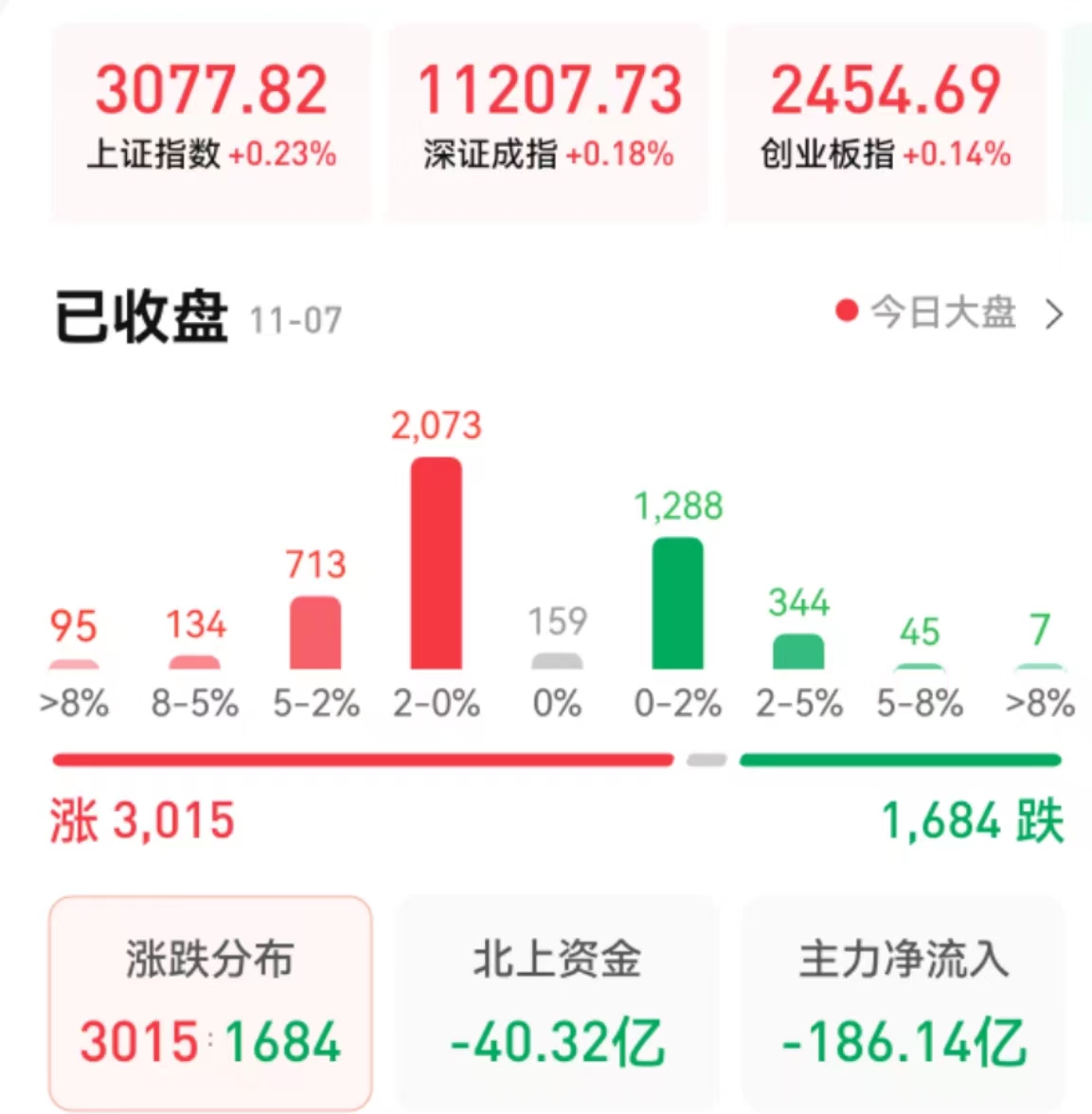 周一(11月7日),A股三大指數(shù)集體收漲,均走出六連陽的態(tài)勢。截至收盤,上證指數(shù)漲0.23%報3077.82點,深證成指漲0.18%報11207.73點,創(chuàng)業(yè)板指漲0.14%報2454.69點;兩市合計成交10061億元,連續(xù)第2個交易日突破萬億元;北向資金凈賣出40.32億元;總體來看,A股個股漲多跌少,