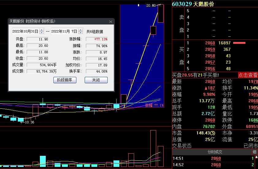 11月7日,熱門股天鵝股份再度漲停,截至收盤,報20.60元,連續(xù)6個交易日漲停,累計漲幅達77.13%。