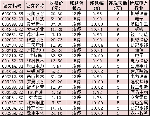 表:連續(xù)上漲5日且今日收盤漲停個股情況: