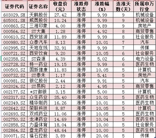 表:連續(xù)上漲5日且今日收盤漲停個股情況:
