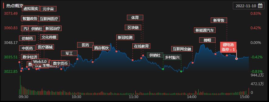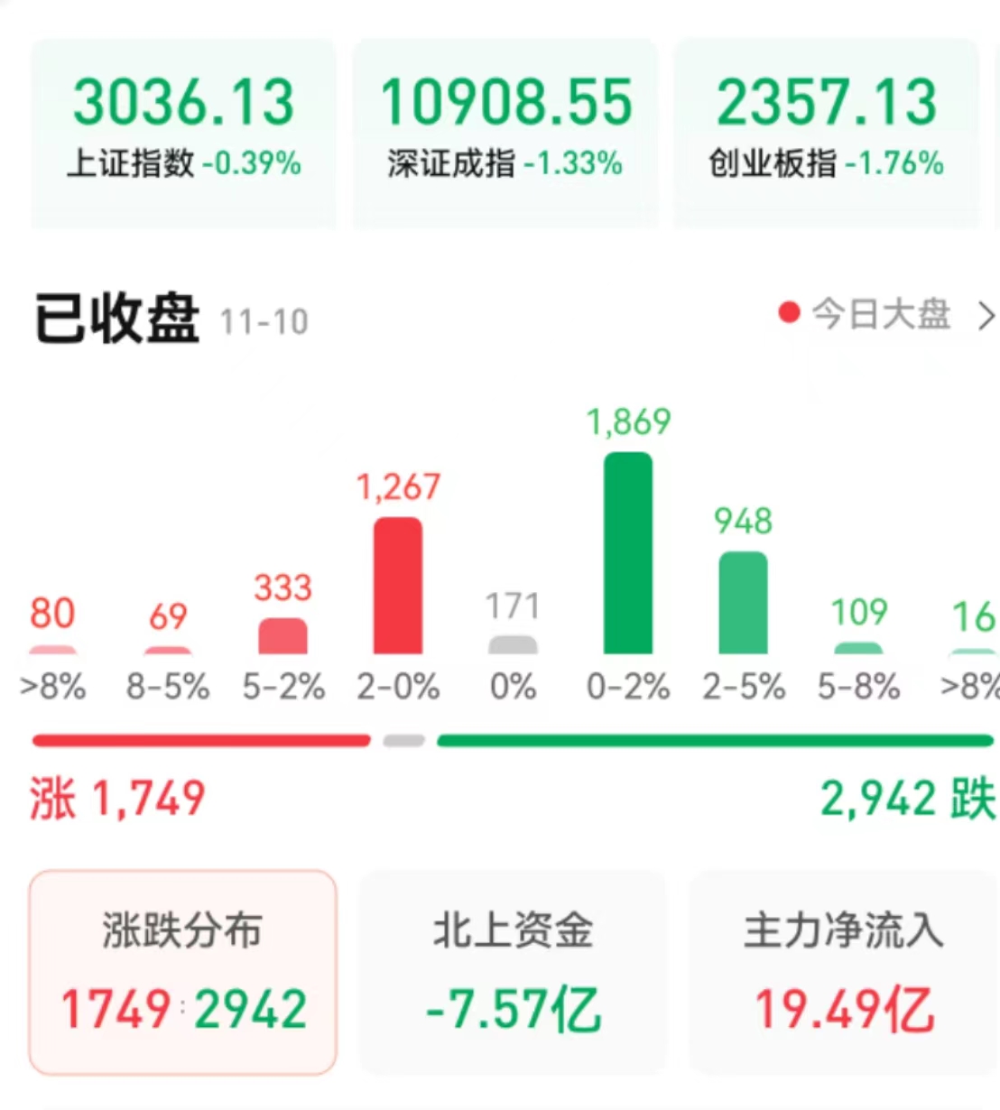 周四(11月10日),A股三大股指震蕩回落,量能依然處于萬億元以下。截至收盤,上證指數(shù)跌0.39%報3036.13點,深證成指跌1.33%報10908.55點,創(chuàng)業(yè)板指跌1.76%報2357.13點;兩市合計成交8428億元,北向資金凈賣出7.57億元。總體來看,A股個股跌多漲少。