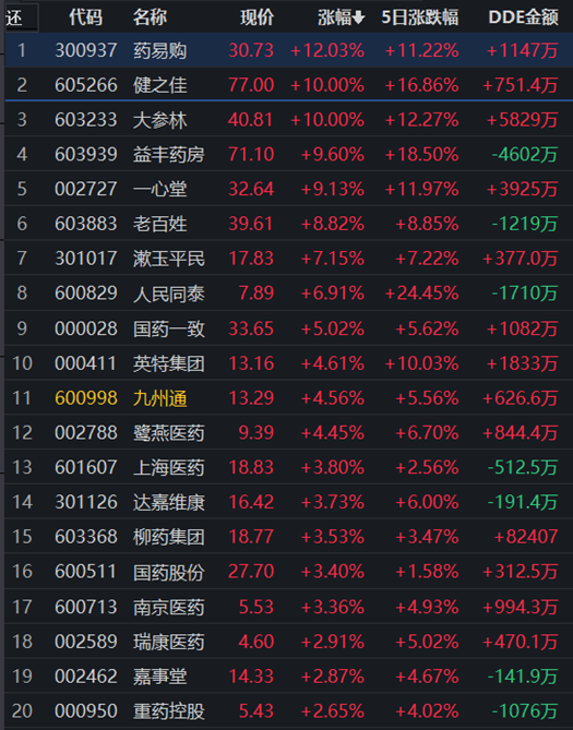 從早盤表現(xiàn)強(qiáng)勢的醫(yī)藥商業(yè)行業(yè)看,截至11月14日11:30,該行業(yè)交易中的31只個(gè)股有28只上漲,其中9只漲幅超5%。從資金流向看,該行業(yè)今天上午大單資金凈流入額達(dá)3610.45萬元,居行業(yè)第16位。